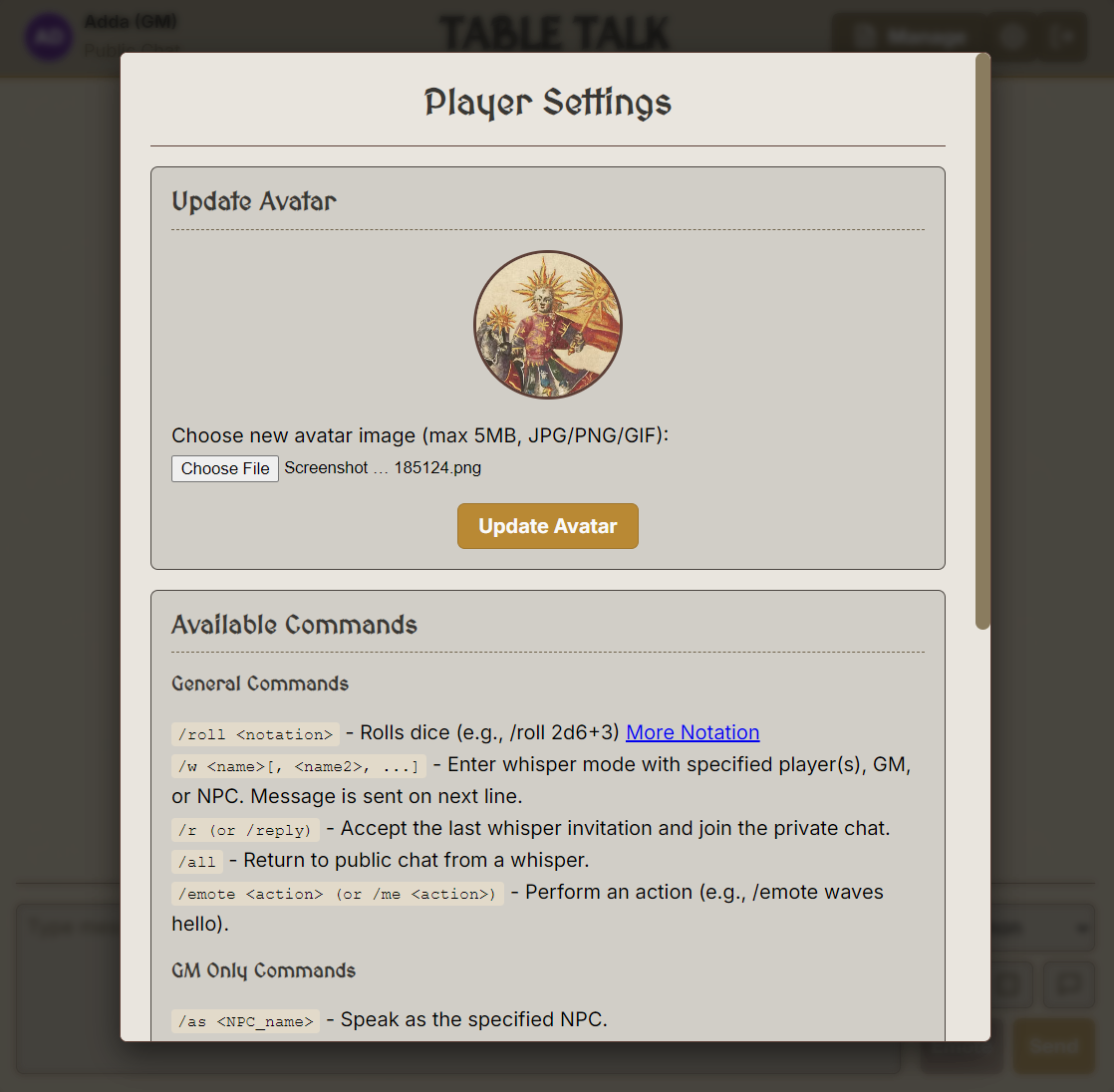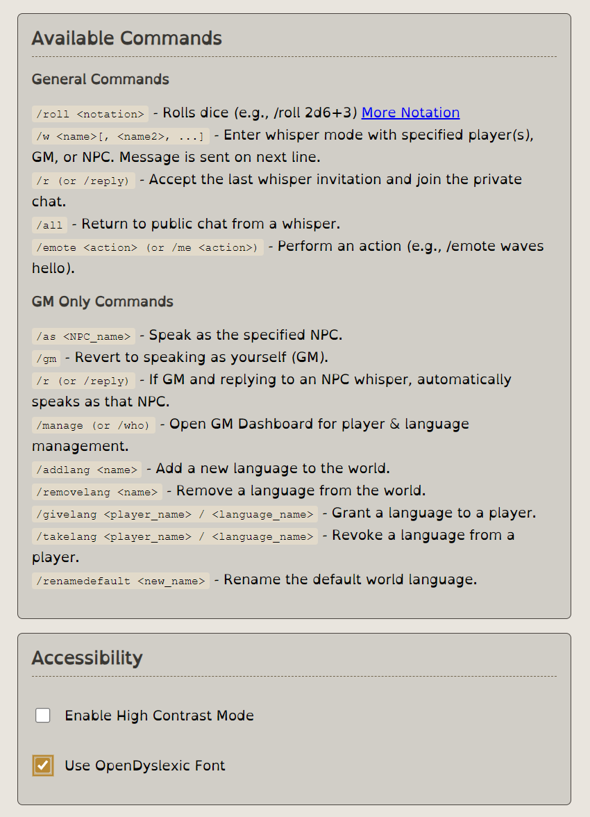 /roll <dice> Roll dice (e.g., /roll 2d20+5, /roll 1d100) /w <player> Whisper to a player (/w Aragorn Hello!) /r or /reply Reply to the last whisper /all Return to public chat from whisper /emote <action> Perform an action (/emote draws sword) /me <action> Same as /emote</action></action></player></dice>
