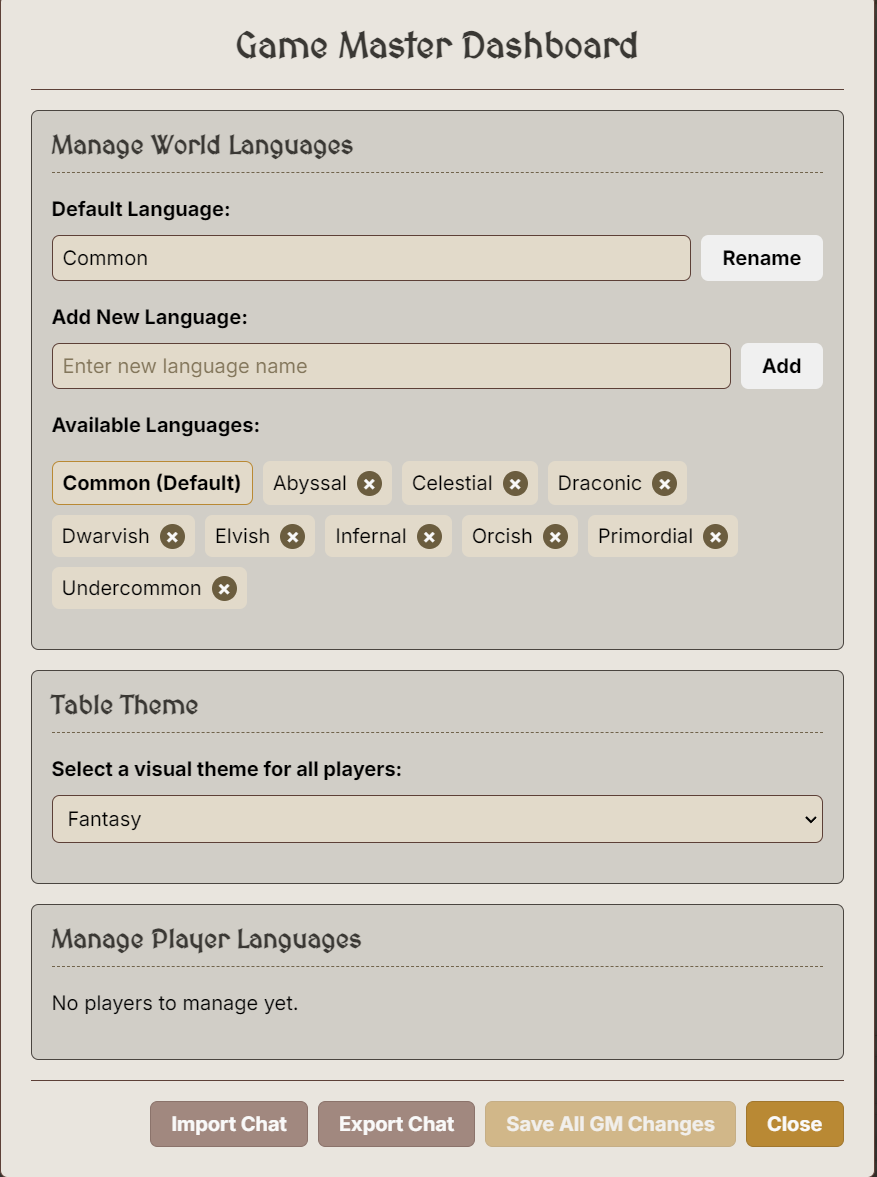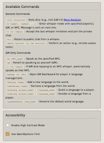/as <NPC> Speak as an NPC (/as Shopkeeper) /gm Return to GM mode /manage Open GM dashboard /givelang <player>/<lang> Grant language to player /takelang <player>/<lang> Remove language from player /save Export chat log and game state /settheme <theme> Change table theme (fantasy/sci-fi)
