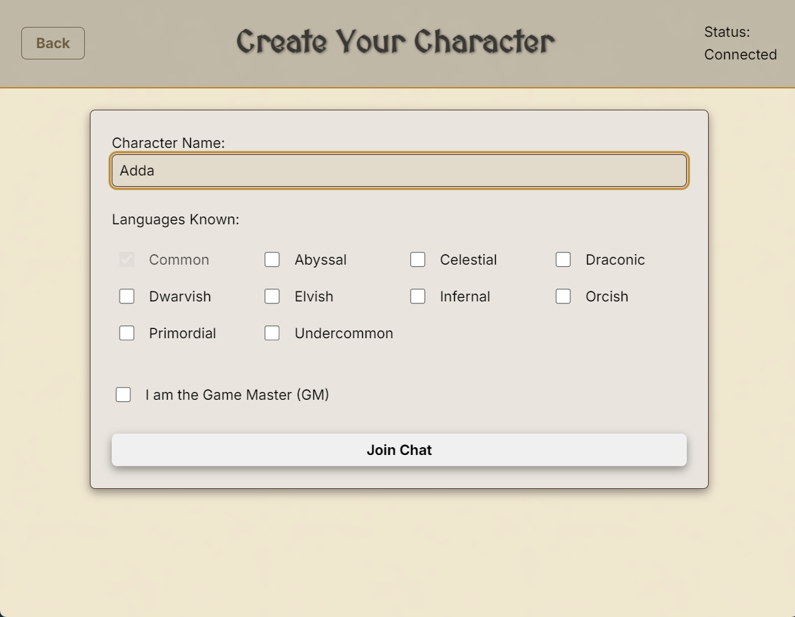 - TIP: enter the name of a previously created character to rejoin without selecting languages again